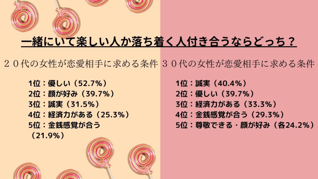 長い目で見るなら「落ち着く人」がいいという声が多かったです。